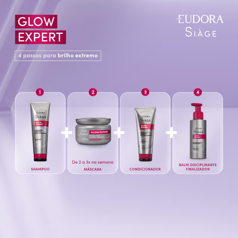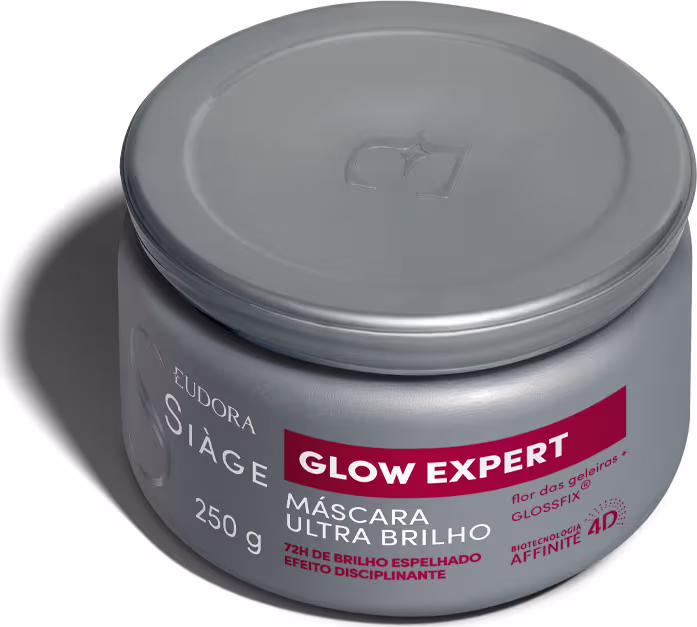 A linha Siàge Glow Expert dá um polimento aos fios, o que deixa os cabelos com um lindo brilho espelhado que dura muito. Inspirada nos Alpes Suíços, a fórmula contém Micropartículas de Flor de Geleiras, Glossfix® e a exclusiva Biotecnologia Affinité 4D, que juntos, deixam os cabelos macios, radiantes e livres dos fios arrepiados.