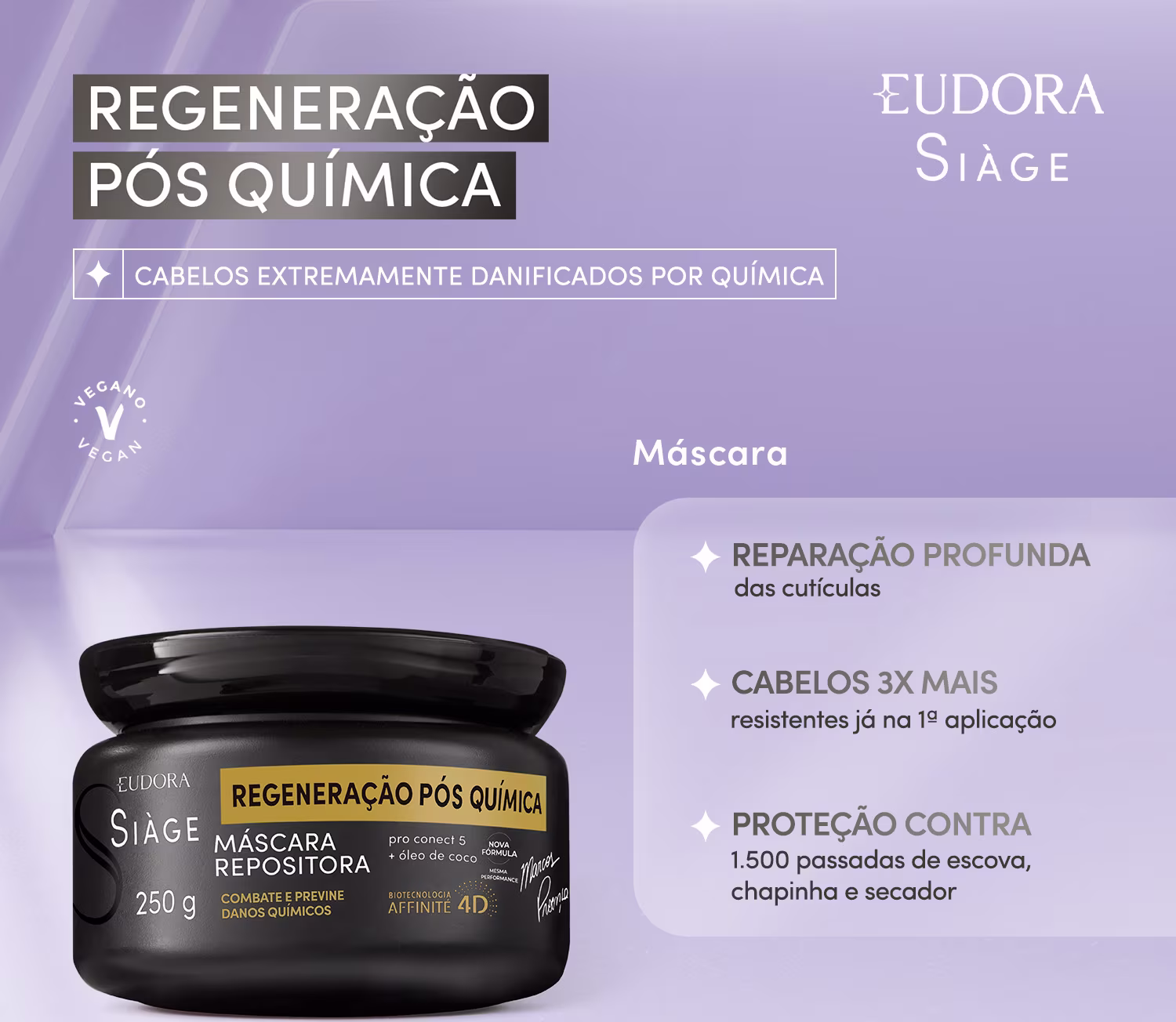 A linha Siàge Regeneração Pós Química é assinada pelo expert Marcos Proença, e traz o complexo tecnológico Pro Conect 5 + Óleo de Coco que promove o religamento das pontes capilares dos fios ressecados e quebrados por agressões químicas, garantindo uma linha completa de resultados de salão para seus cuidados capilares diários.