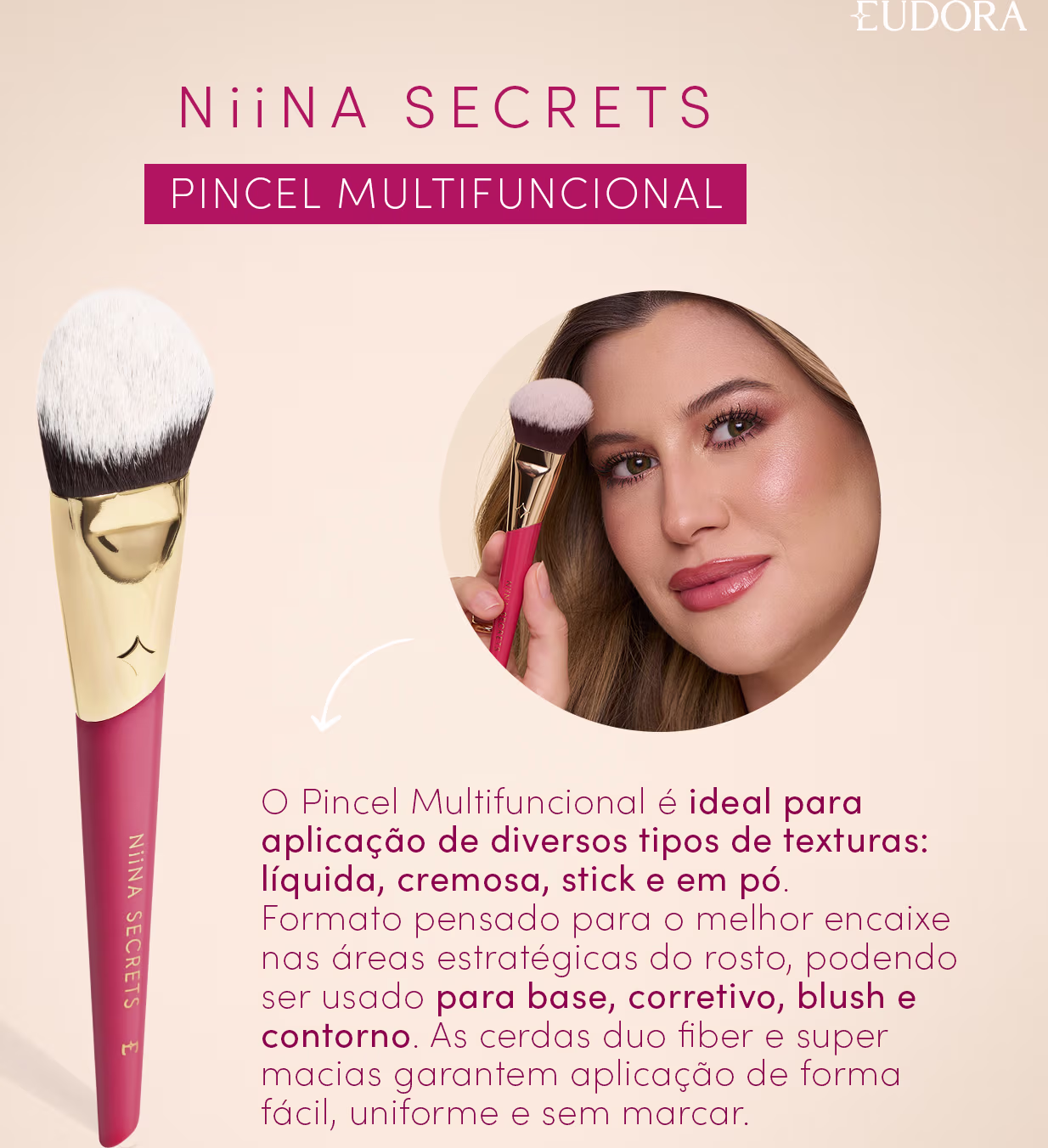 O Pincel Multifuncional é um aliado da beleza! Seu formato inovador foi pensado para o melhor encaixe nas áreas estratégicas do rosto, podendo ser usado para base, corretivo, blush e contorno. Por isso, é ideal para aplicação de diversos tipos de produto em todas as texturas: líquida, cremosa, stick e em pó. Além disso, suas cerdas duo fiber super macias garantem aplicação de forma fácil, uniforme e sem marcar.