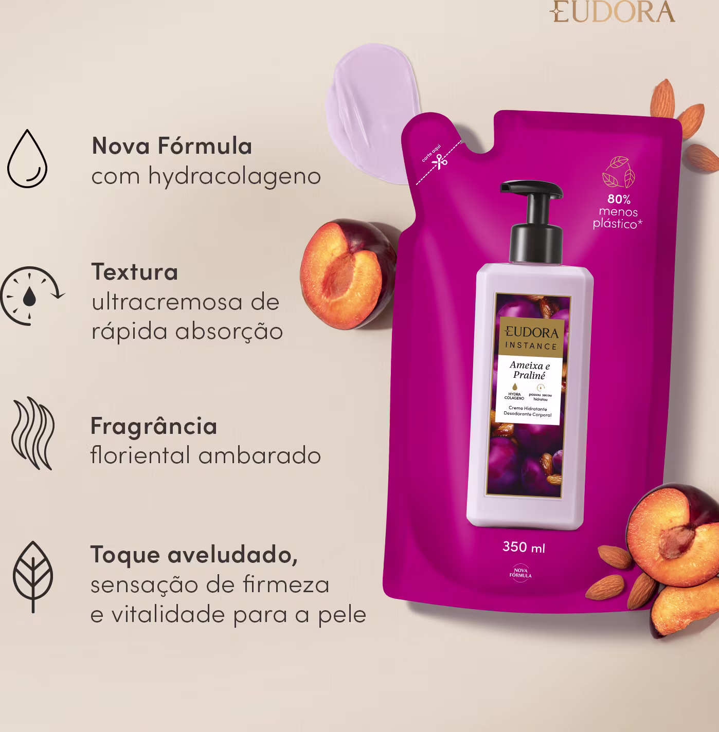 Eudora Instance sabe: você adora se cuidar e seu tempo é precioso. Instance é cuidado no seu tempo. Por isso, apresenta Ameixa e Praliné, uma linha que une a suculência da Ameixa Roxa com a indulgência do Praliné, combinação para a rotina de cuidados da mulher de Eudora!