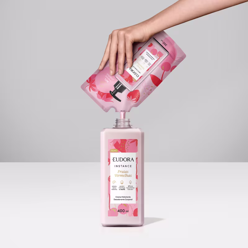 O novo Refil Creme Hidratante Desodorante Corporal Frutas Instance Vermelhas repõe a fragrância suave e deliciosa do seu creme hidratante preferido!