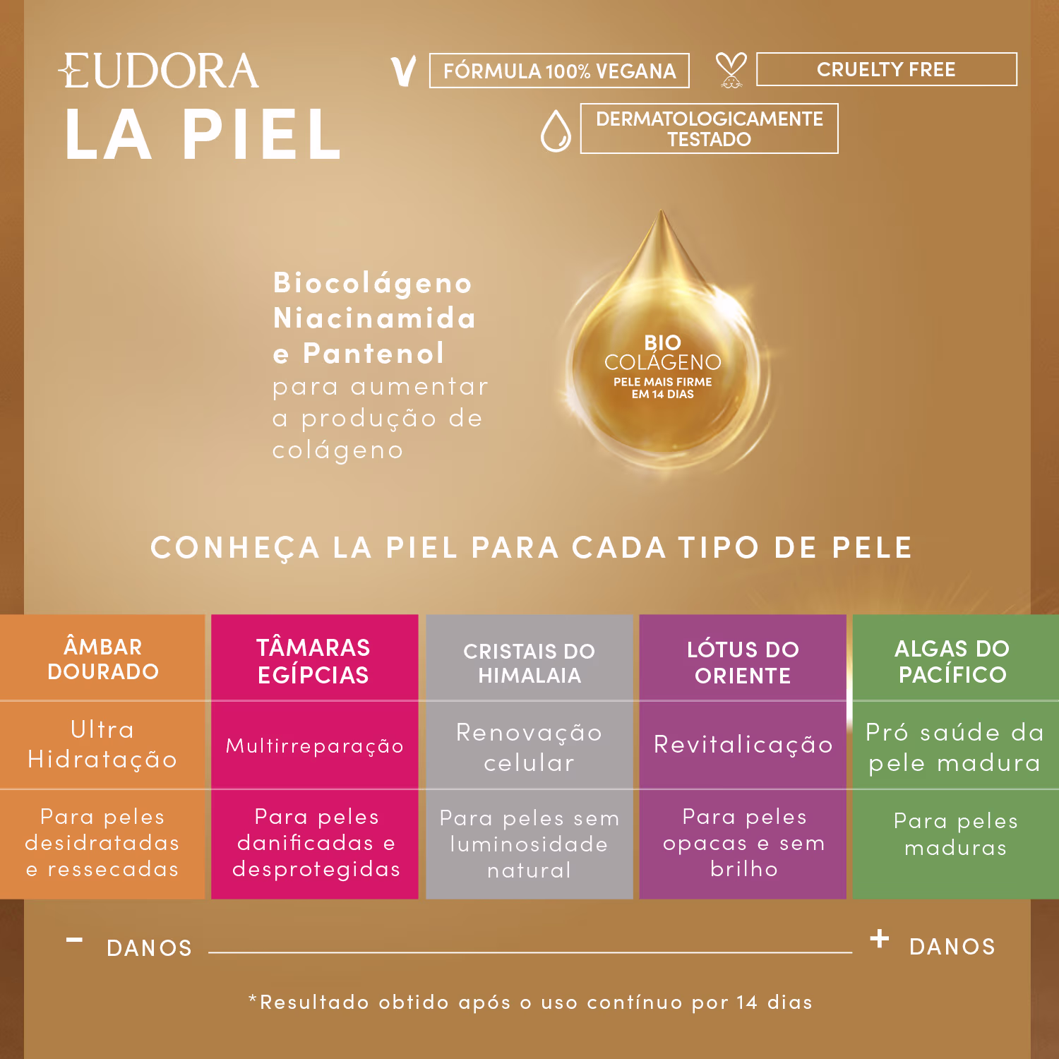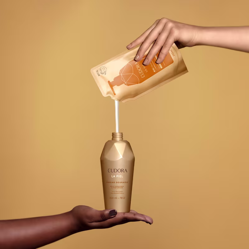 O Refil Hidratante Desodorante Corporal La Piel Âmbar Dourado deixa sua pele mais firme e macia, garantindo economia e sustentabilidade para sua rotina.