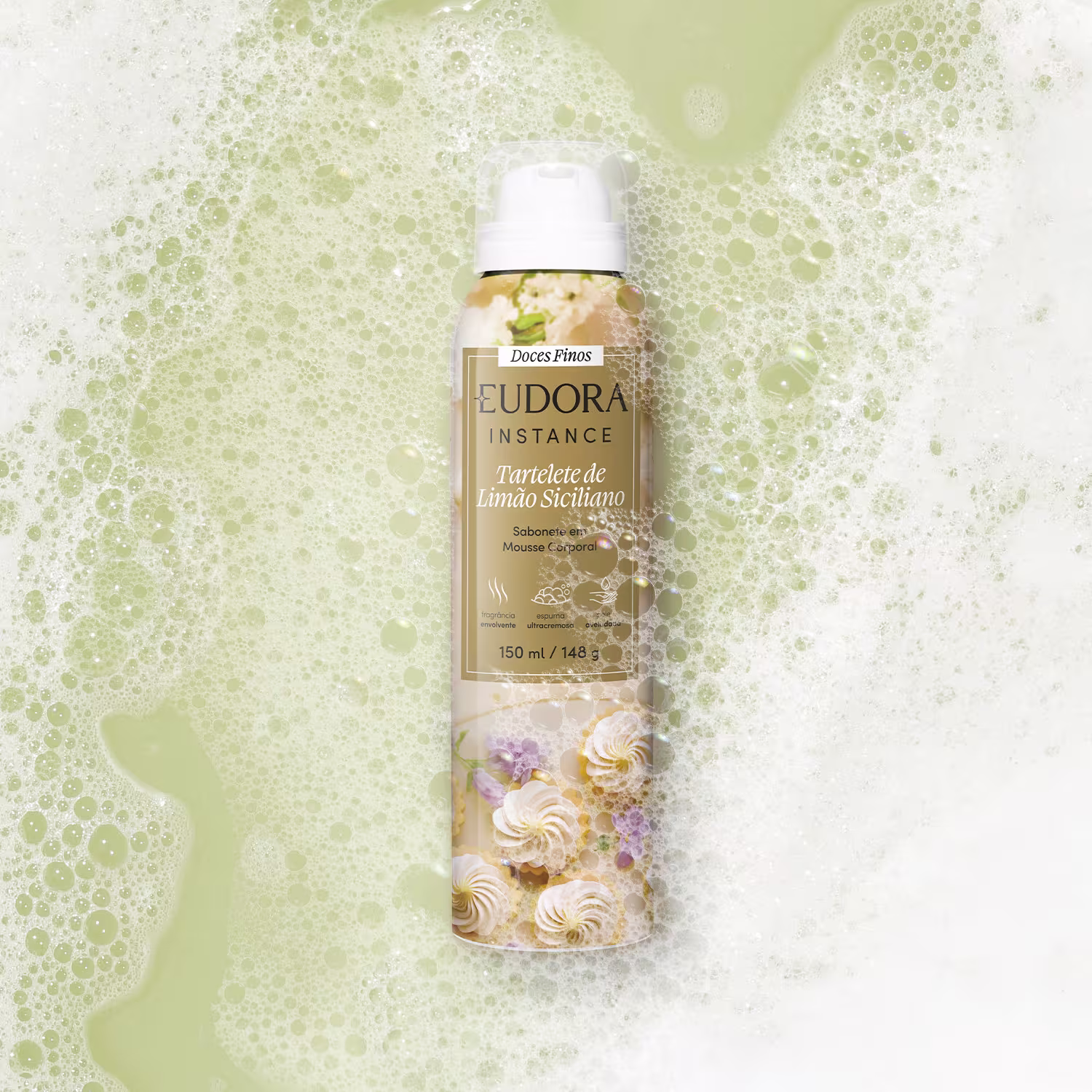 Eudora Instance Sabonete em Mousse Corporal Tartelete de Limão Siciliano proporciona uma experiência única. Com textura ultra cremosa, deixa a pele macia e aveludada. Inspirado no glamouroso universo dos Doces Finos, traz uma explosão de fragrância e limpeza delicada para deixar o banho envolvente e revigorante.