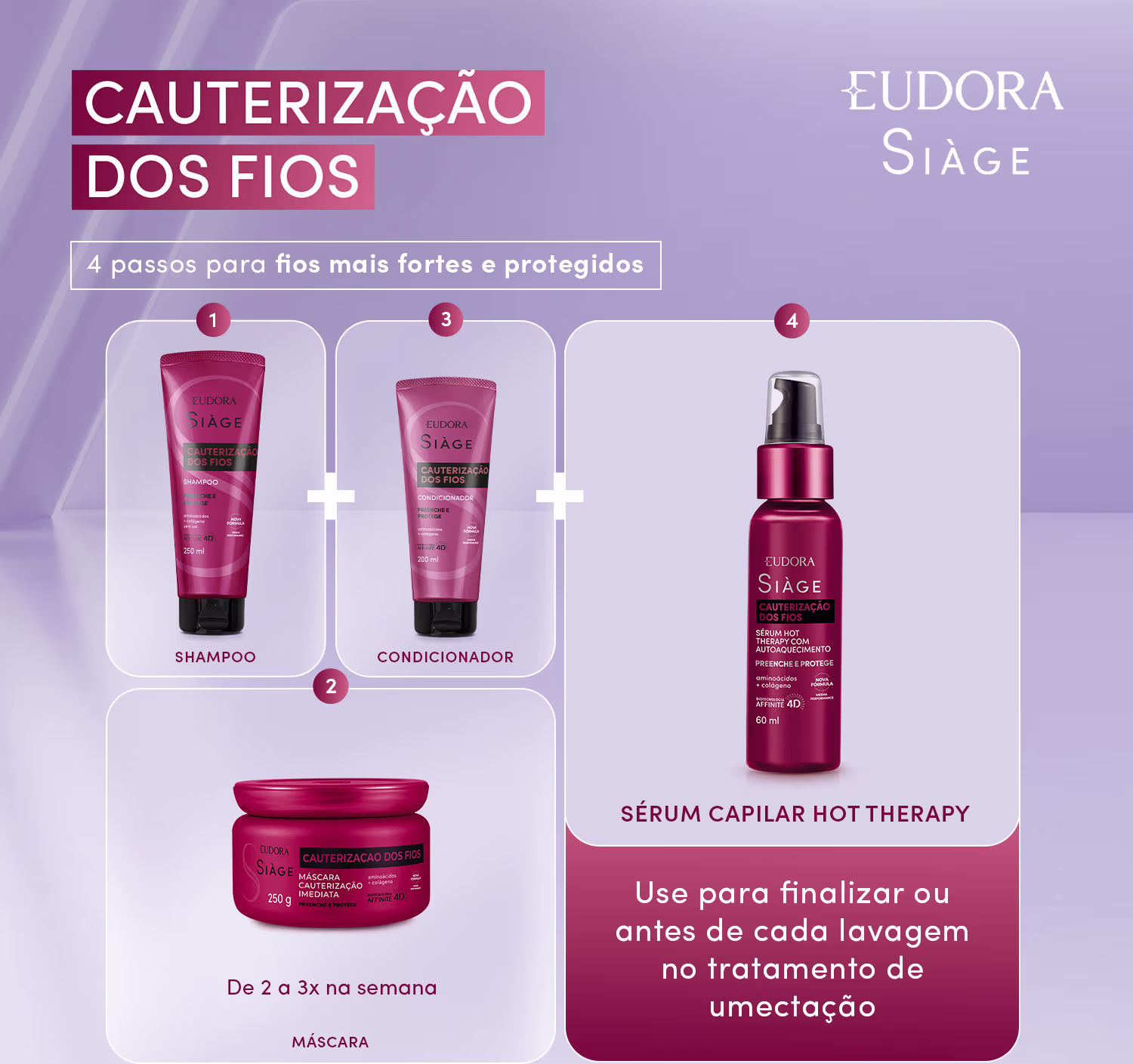 A linha Cauterização dos Fios possui tecnologia de autoaquecimento: ao aplicar o produto e friccionar as mãos, você sentirá um leve aquecimento, isso faz com que os ativos penetrem de forma mais efetiva nos fios além de garantir diversos benefícios. Maior performance!