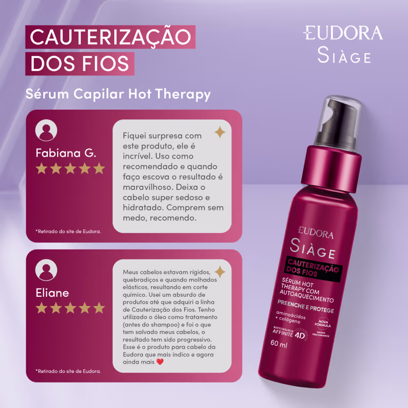 Eu nunca usei na minha vida uma linha tão perfeita como a EUDORA. Todos os produtos são MARAVILHOSO, em especial este sérum (uso a mais de 6 anos) gente o cabelo fica cheiroso, com brilho, e uma hidratação maravilhosa. Tenho luzes, uso a linha para cabelos loiro, a máscara então sem palavras "perfeita" Comprei recentemente toda a linha para crescimento, ainda não usei estou aguardando chegar. Mas tenho certeza que será perfeito. Parabéns EUDORA produtos de qualidade com preço que cabe no orçamento.