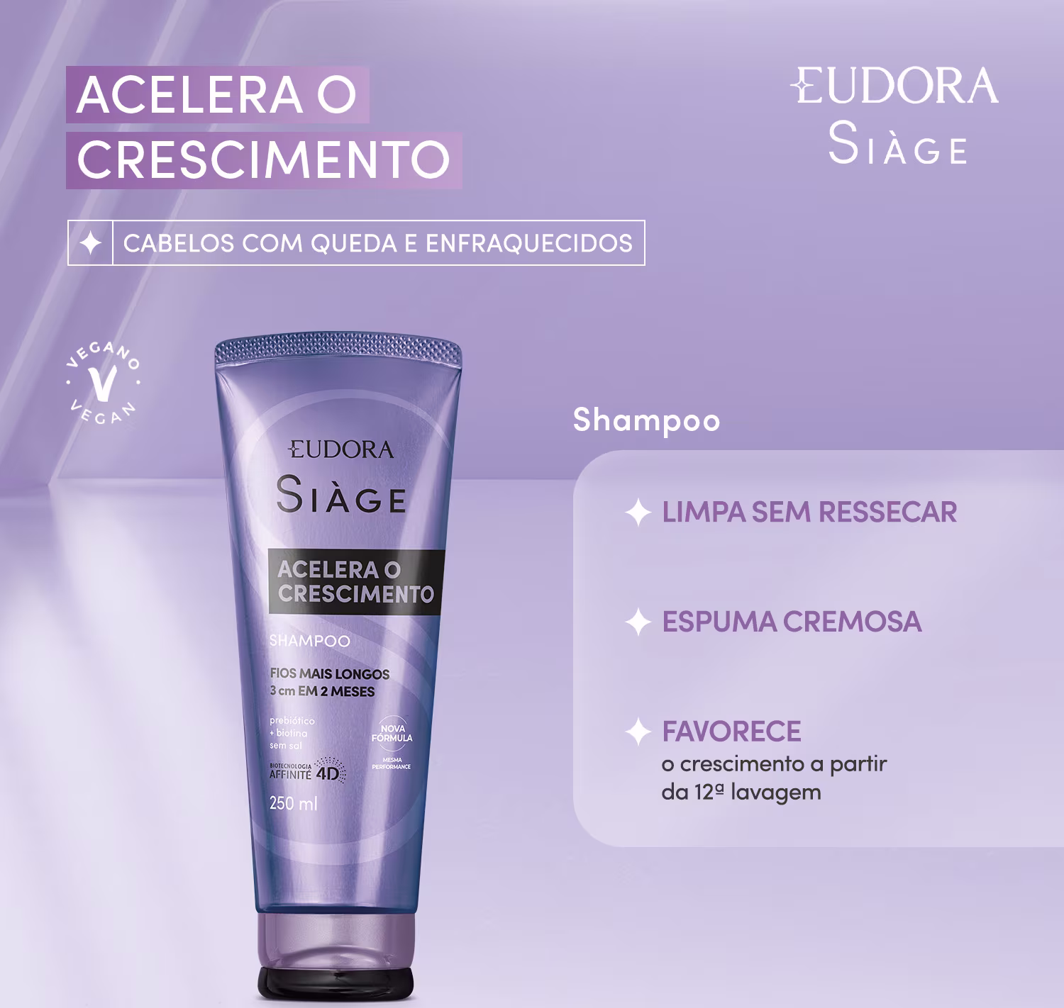 O QUE A LINHA ACELERA O CRESCIMENTO FAZ?A linha Siàge Acelera O Crescimento estimula o crescimento saudável e equilibrado dos fios. Sua fórmula hidratante é poderosa e promove um fortalecimento da fibra capilar, que além de contribuir para o crescimento acelerado dos fios, ainda reduz e previne a queda natural, o que traz vida ainda mais longa para os seus cabelos. O resultado é visível: cabelos até 3cm mais longos em 2 meses, com aumento de 1.500 fios no primeiro mês de uso.