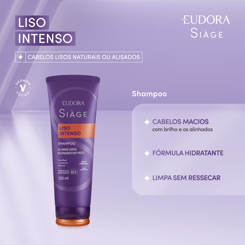 Eudora Siàge Liso Intenso possui fórmula inteligente que se adequa a lisos naturais, alisados ou com ondas indesejadas, proporcionando liso extremo por muito mais tempo. Seus produtos entregam hidratação, cuidados diários, cabelos 2x mais lisos e bloqueio do frizz.