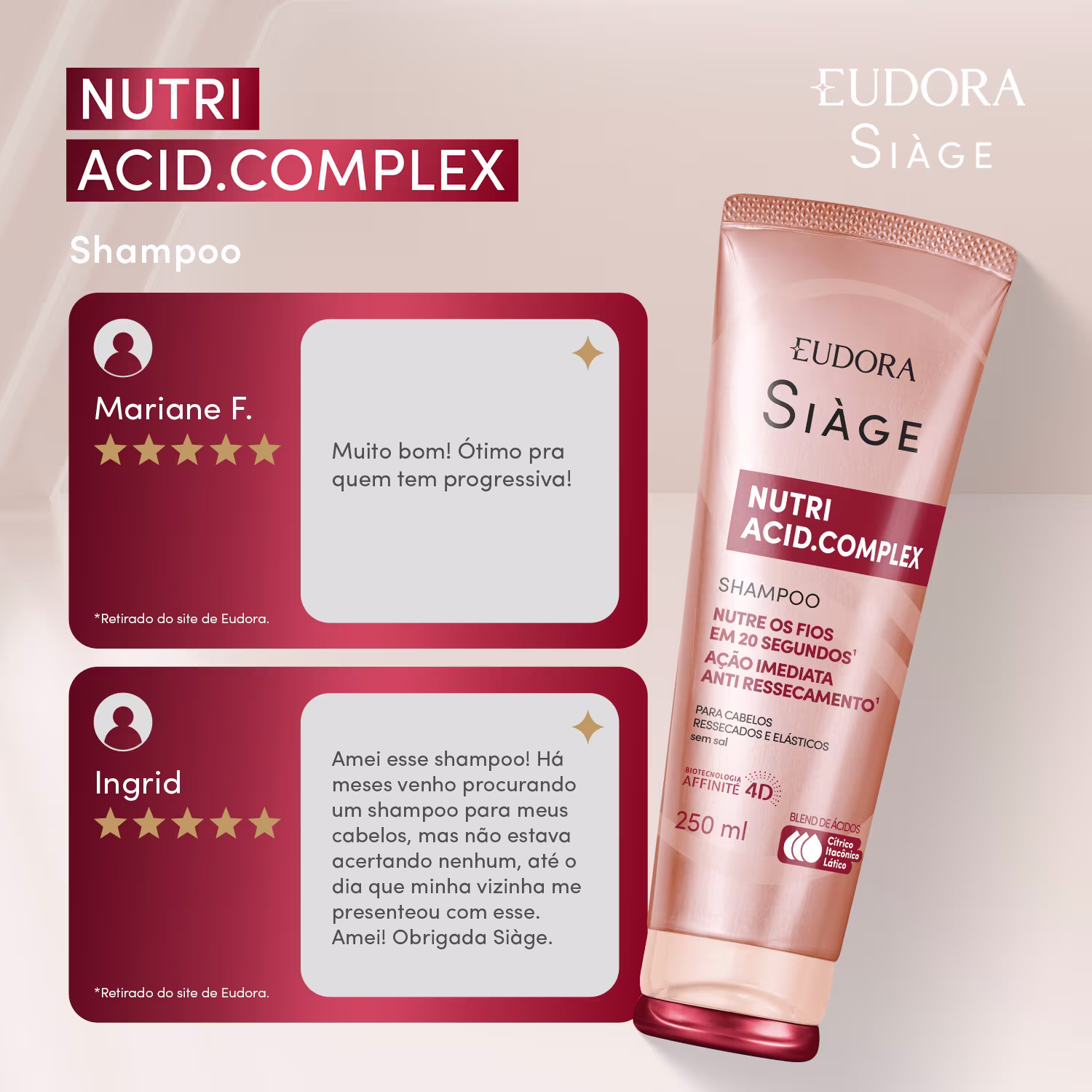 "Se o seu cabelo está poroso, com muito frizz, com volume excessivo, ele precisa de NUTRIÇÃO. A nutrição que vai repor os lipídios, que vão deixar as cutículas alinhadas. Este shampoo promove uma limpeza inteligente com ação antirressecamento , nutrindo os fios desde a lavagem.” Expert em cabelos de Eudora