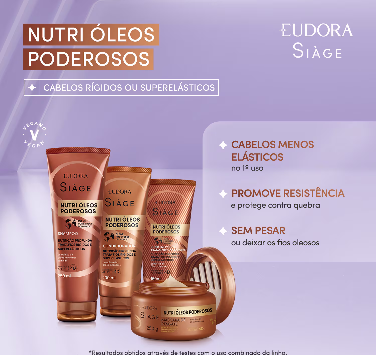 A linha Siàge Nutri Óleos Poderosos é livre de petrolatos, parabenos e sal, além de ter em sua fórmula inovadora o poder do complexo de óleos milenares, que nutre e trata fios rígidos e superelásticos já no 1º dia de uso.