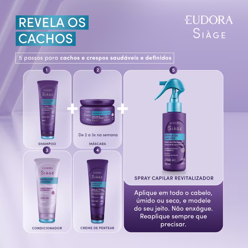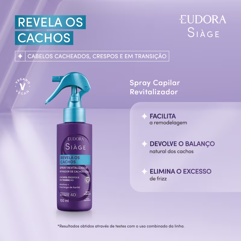 O Spray Capilar Revitalizador Siàge Revela Os Cachos entrega cachos impecáveis, ultra hidratados e definidos até a última volta.
