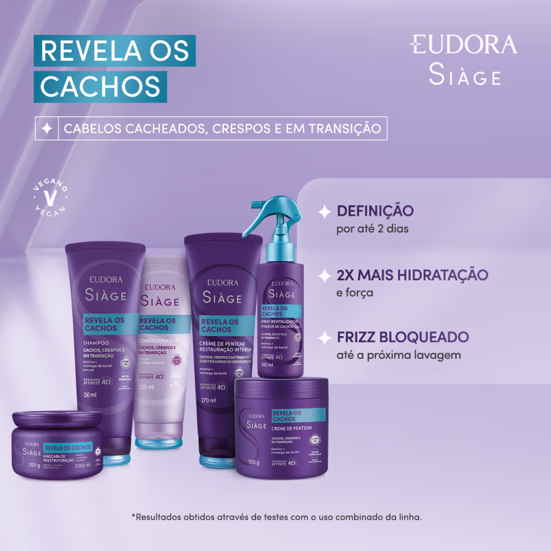Especialmente composta por produtos para cabelos cacheados, ondulados, crespos ou em transição, a linha Siàge Revela os Cachos entrega força, alta definição, 2x mais hidratação e 3x menos frizz para seus fios.